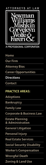 Newman, Williams, Mishkin, Corveleyn, Wolfe & Fareri, P.C. - Attorneys At Law 570-421-9090, Fax 570-424-9739 712 Monroe Street, Stroudsburg, PA 18360 © 2008 Newman, Williams, Mishkin, Corveleyn, Wolfe & Fareri, P.C. - Attorneys At Law, All Rights Reserved Disclaimer |